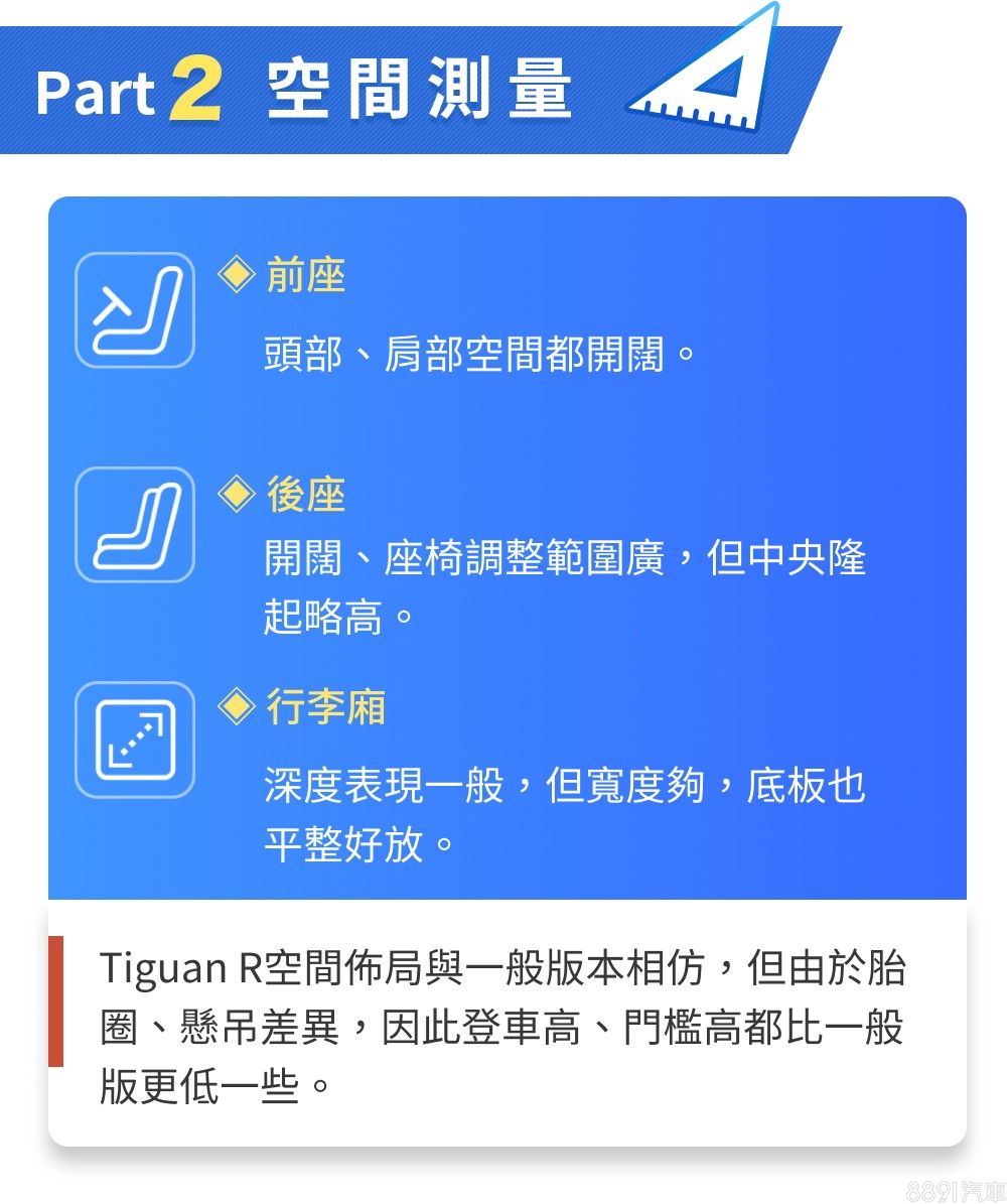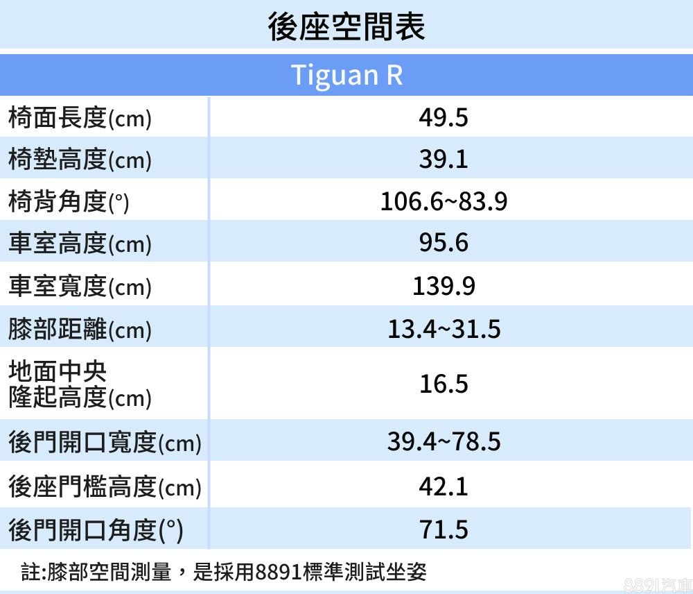 雖然R是性能化車型,但座椅造型中規中矩,稱不上有跑格,空間表現上與一般Tiguan車型相同,寬度、高度都有不錯表現,空間感方正又開闊。椅面長度沒有腿靠延伸是比較可惜的地方,一般路上開夠舒適,但上賽道激烈操駕,大腿支撐便略顯不足。