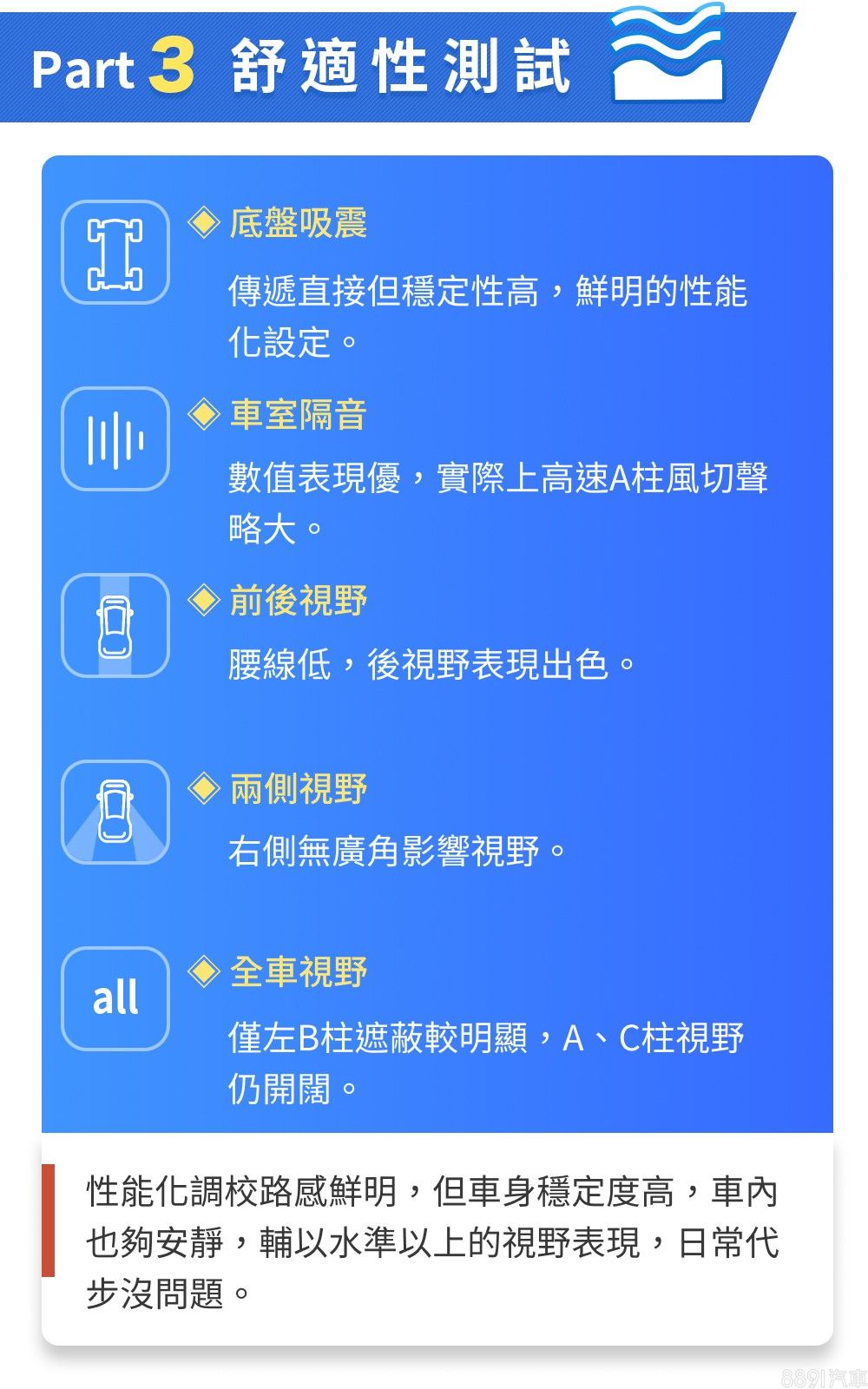 在Comfort模式下排氣閥門關閉,也沒有模擬聲浪系統,噪音來源主要是高速時A柱風切聲較明顯,以及大尺碼配胎設定下,胎噪表現也會略大一些,但整體數值表現依舊不錯。