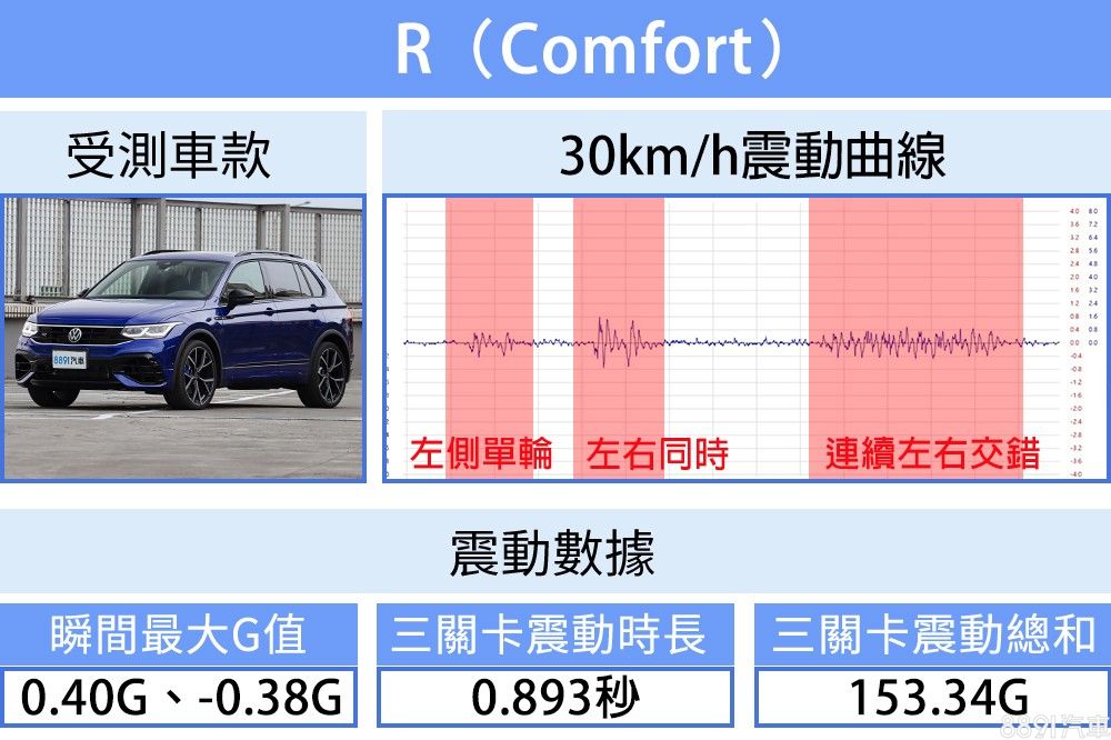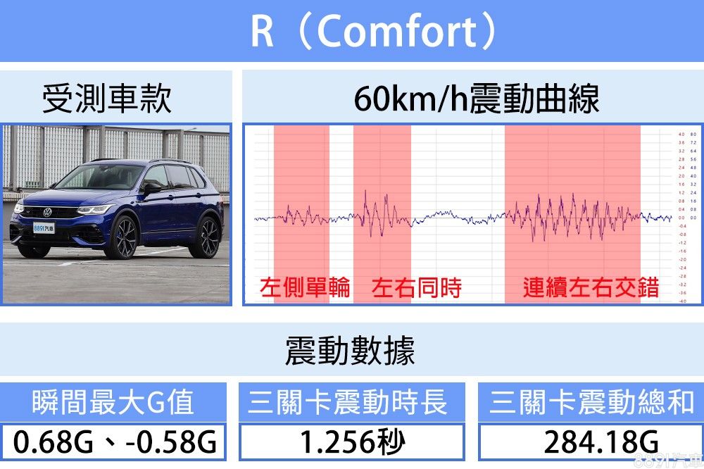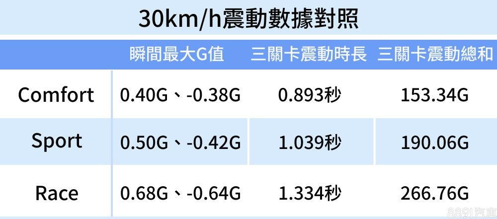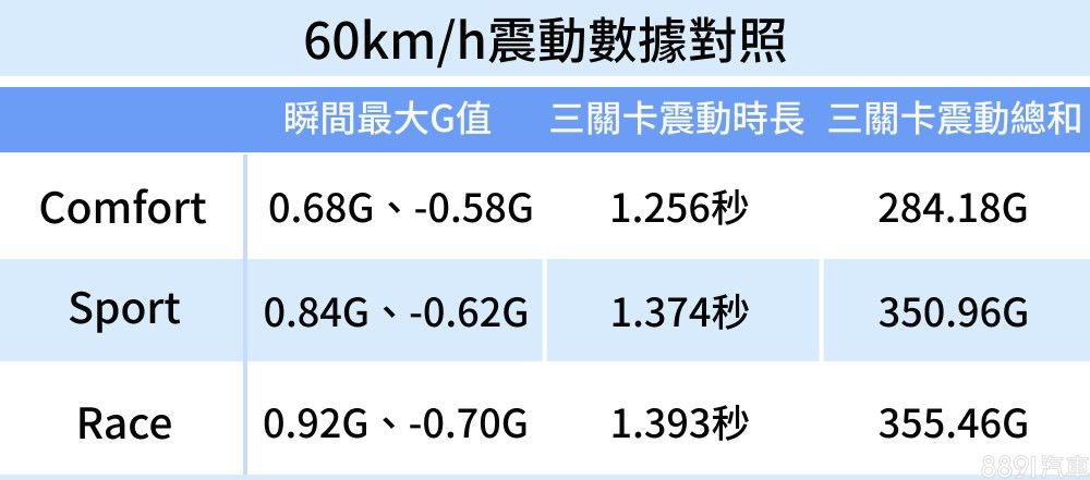 在Comfort模式下阻尼設定較弱,行經關卡時衝擊感最輕微,不論最大G值、時長、總和都是最低者,感受最為舒適。
