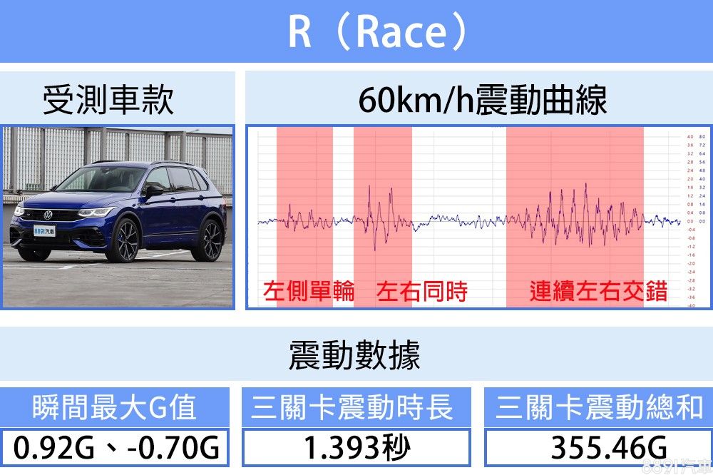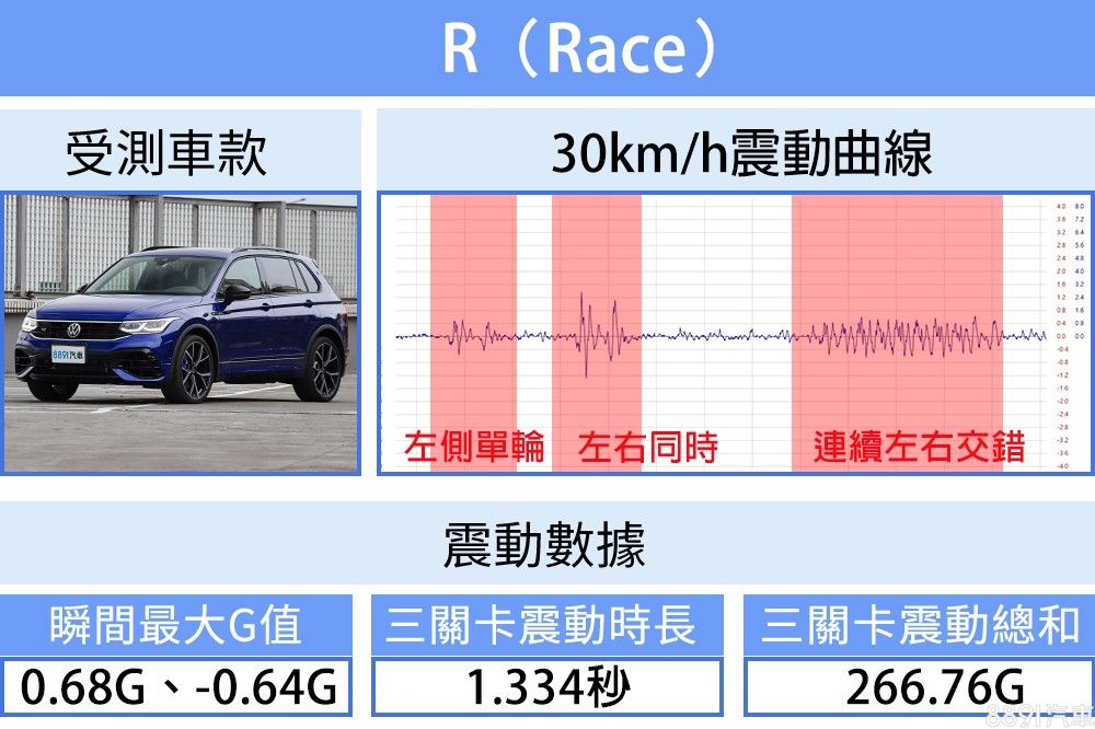 Race的震動圖形與Sport相似,但各關卡區間G值表現都相應增加,衝擊感最為明顯,不過貼地性出色,車身擺盪、回穩速度與Sport模式相仿,因此時長、總和並無暴增。