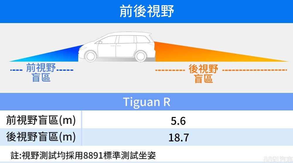Tiguan擁有短截的後懸,車尾腰線也算平直,讓後視野盲區僅有18.7m;高著坐點坐椅設定,也有助於減少視線盲區,因此前視野表現也算優異。