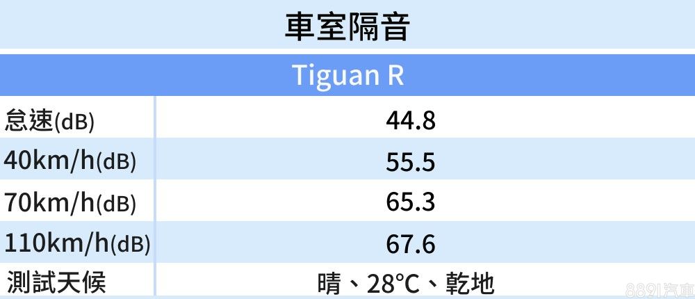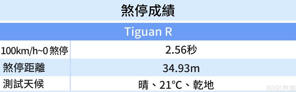 Tiguan R擁有專屬煞車套件,配胎寬度達到255mm,從100km/h狀態下全力煞停僅有34.93m距離,成績甚至優於Audi RS4 Avant!但就如賽道表現所述,在長時間激烈操駕下,抗熱衰方面仍有強化空間。
