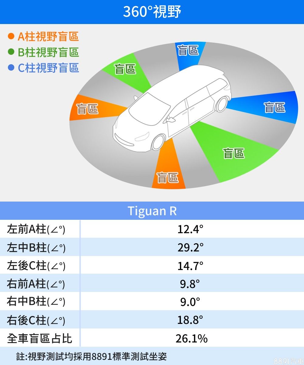 Tiguan全車窗戶面積夠大,不過車內飾版較為厚實,讓左側B柱遮擋視野明顯,但整體綜合下來遮蔽率26.1%算低,環景視野優異。