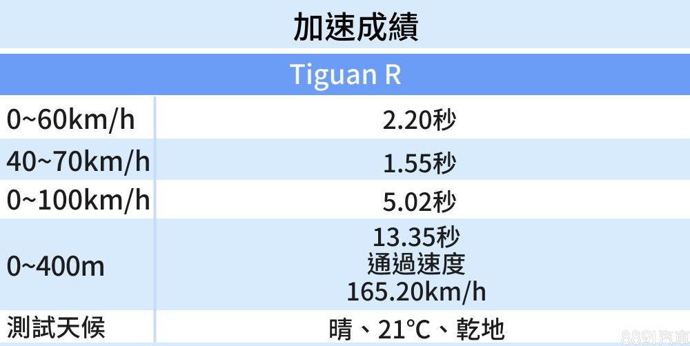 Tiguan R採用VW集團相當常見、代號EA888的2.0升渦輪引擎,目前進化到第四代,而本車是目前出力最大機型,有320hp/42.8kgm,這數據比AMG 35系列來得大一點;變速箱則是代號DQ381的7速DSG雙離合自手排,原廠公布0~100km/h可在5秒完成。