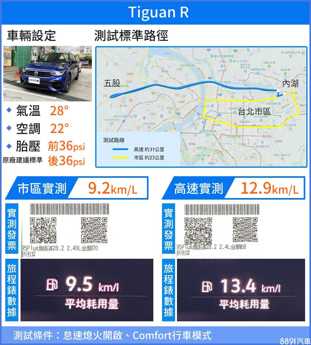 Tiguan R的2.0升引擎是性能話設定,不具備氣缸休止和Eco模式、空擋滑行等節能設計,只能以輸出最和緩的Comfort進行油耗測試,但實測數據倒是不若想像中耗油,高速測試正逢上班尖峰時刻,塞車情況下均速僅有50km/h左右,仍繳出12.9km/L的成績,市區則仰賴怠速熄火功能,每遇紅燈停車都能確實熄火,跑出9.2km/L並不差,以性能休旅而言表現出色!