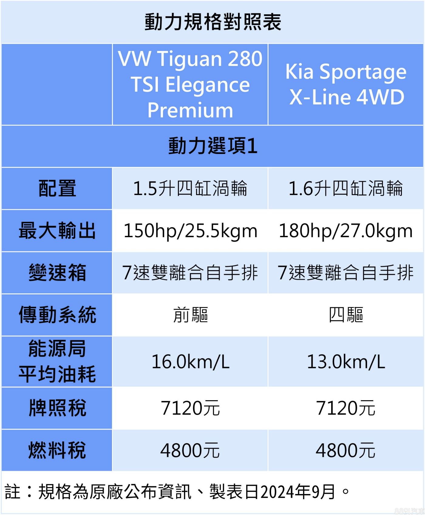 兩車都採「渦輪四缸+7速DCT」的配置,1.5升的Tiguan 280 TSI雖然排氣量較小,但按國內稅制與對手仍屬同級距,牌燃費負擔相同。出力表現上,Sportage為四輪驅動,並擁有較充沛的最大輸出,採前驅設定的「入門Tiguan」則在能效表現上更加出色。