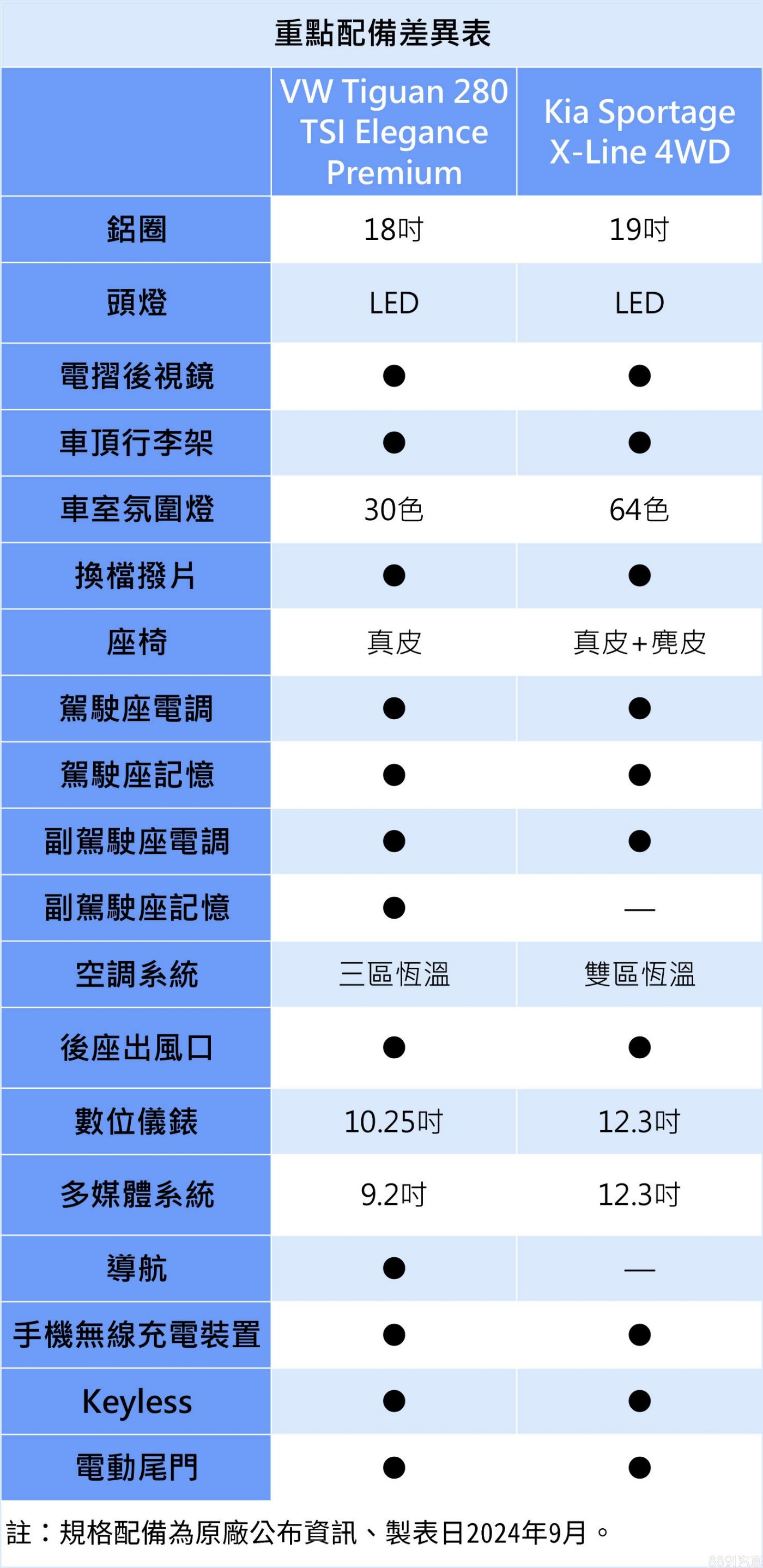 VW日前更新國內Tiguan編成,將145.8萬的280 TSI Elegance Premium設為車系入門,亦是280 TSI動力的唯一選擇。Sportage最頂的X-Line 4WD,是車系唯一四驅款,138.9萬定價比對手便宜6.9萬,雖然整體車格稍大,但實際體驗難分軒輊,兩車都以充裕的車室空間和出色的乘坐舒適性著稱。