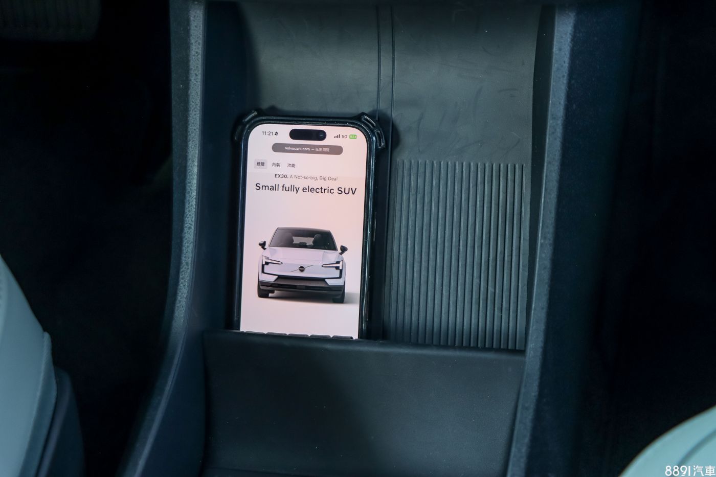 智慧型手機無線充電在中控螢幕下方,底座可以將手機良好固定,不怕開車時晃動。
