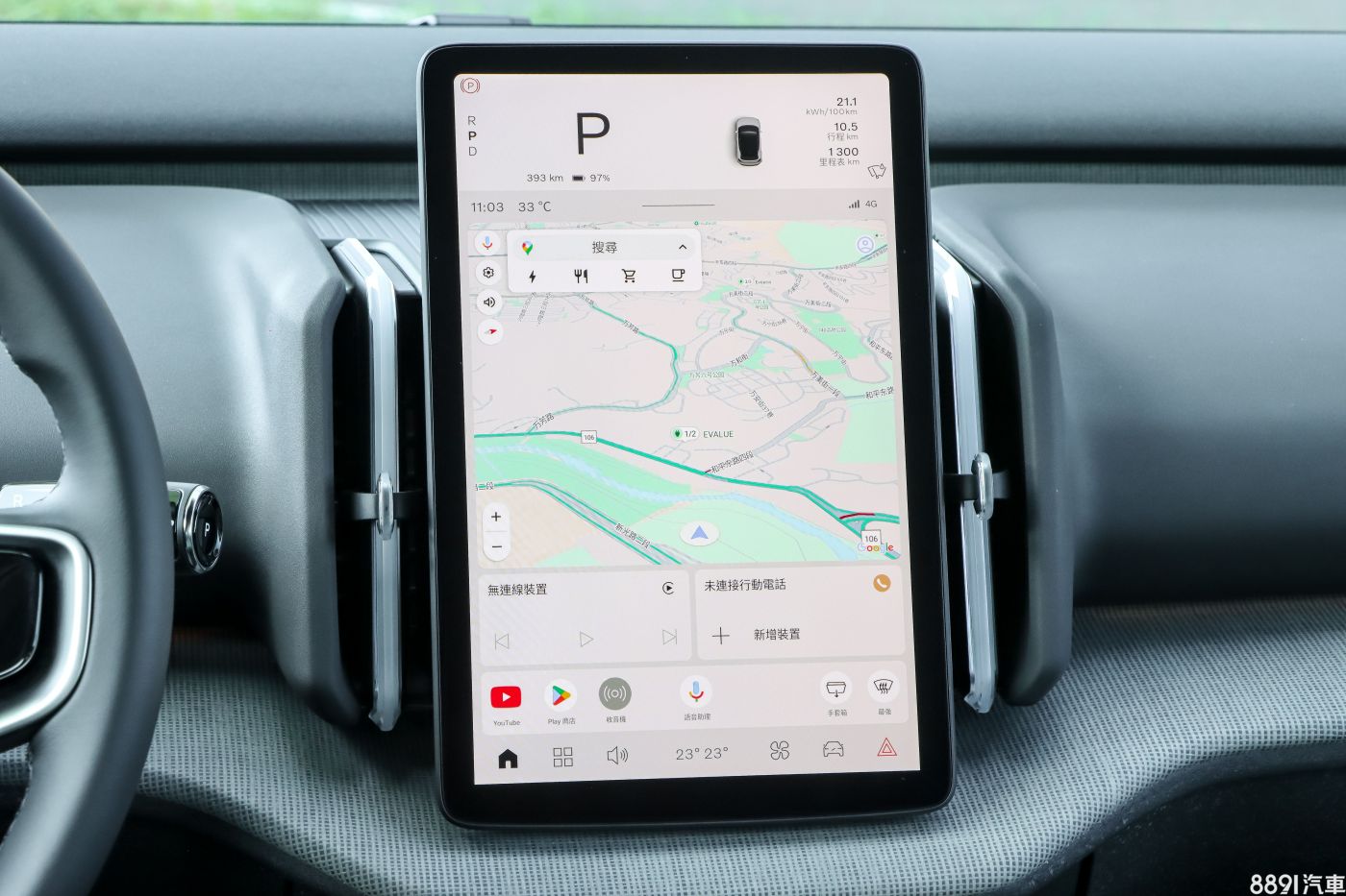 車室簡潔,所有操作放在中央單一12.3吋直立觸控螢幕,也取消傳統儀錶,是概念車設計語彙直接下放,實際使用過後便利度高,零層級設計讓人在首頁就能找到所有功能,加上採用專為VOLVO設計的Google車載資訊娛樂系統,地圖可以顯示到達目的地時的預估電池電量,非常方便,APP整合性很高,日後還能OTA雲端更新增加功能。
