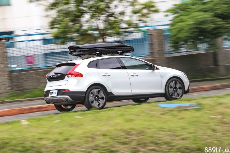 墊高的底盤高度,讓V40 CC有更微翹的屁股曲線,如果看不出高度的差異,仍舊可以從防刮材質,加上印有「Cross Country」字樣的後氣壩飾板一眼辨識,此外試駕車型配有原廠車頂架(14732元)與車頂置物盒(42504元)的組合,約要價5萬7左右,而這副車頂置物盒本體重18公斤,容積為320L,可乘載共75公斤的物品。