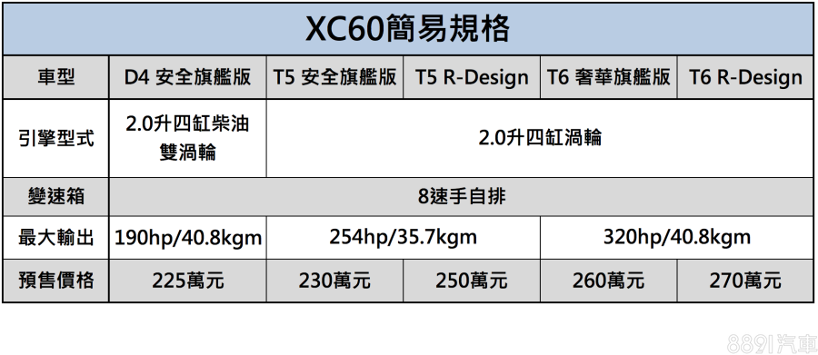 國內初步引進現役的D4、T5與T6引擎,D4的2.0升柴油雙渦輪,最大輸出為190hp / 40.8kgm,原廠0~100km/h加速8.4秒,T5 2.0升渦輪引擎,則是254 hp/35.7kgm,百公里加速6.8秒,而T6 2.0升引擎藉由機械+渦輪增壓下,榨出320hp/40.8kgm最大輸出,百公里加速進步至5.9秒。