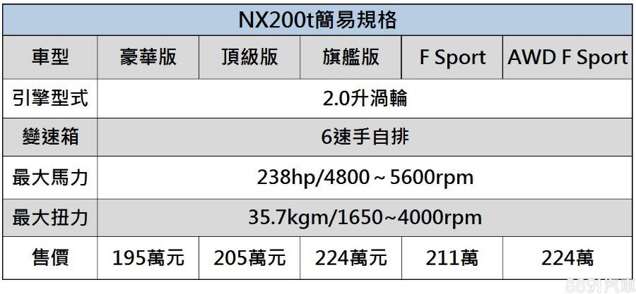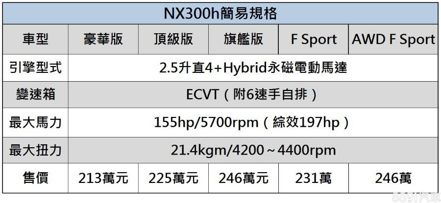 NX是Lexus目前重要的暢銷車型,小改款最快預計在10月導入國內,外觀、內裝均經過細微調整,動力則預期比照現有編成,有2.0升渦輪與2.5升NA+電動馬達Hybrid兩種動力規格,兩動力皆規劃F Sport版與四驅,共計10種車型。