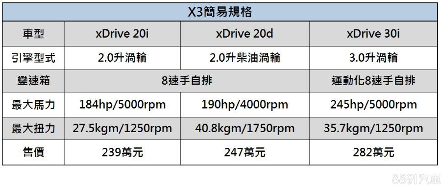 目前已經演化到第三代的X3,除了向來的運動感,豪華程度比過去高不少,內裝走向大致比照5系列(G30),車身尺寸與軸距也較前代放大,無非要從賓士GLC那板回一城,國內預計在年底導入,估計X3 M40i也會同步登台。