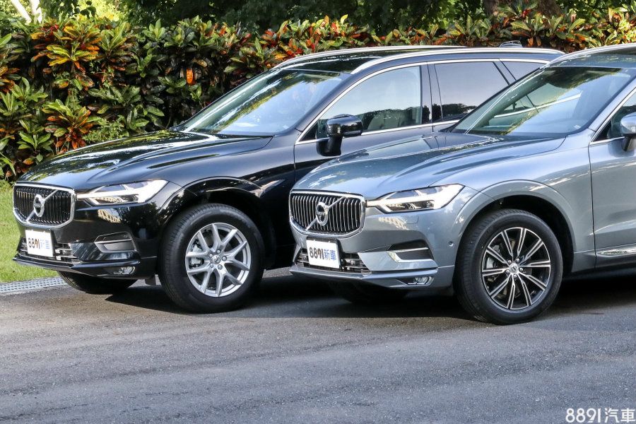 左方黑色車輛為T5 Momentum,標準配置為18吋鋁圈,搭配235/60R18的馬牌CSC5跑胎,若是R-Design車型,尺碼則改成和右方T6車型相同的235/55R19,配胎為米其林Latitude Sport 3,屬性能訴求的SUV用胎,兩車型的輪胎尺碼與等級都屬高階,也符合XC60所需的抓地力及靜肅性表現。
